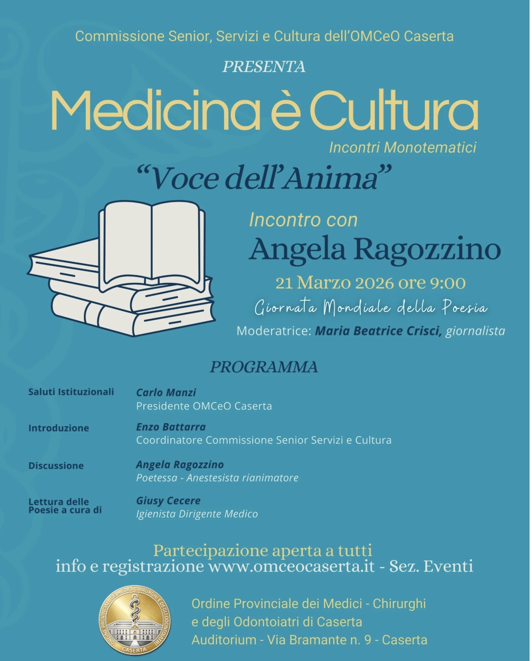 Si terrà il 21 marzo alle ore 9 a Caserta, presso l’Auditorium dell’Ordine dei Medici, l’evento dal titolo “Voce dell’Anima”, organizzato dall’OMCeO di Caserta in occasione della Giornata mondiale della poesia, secondo appuntamento della rassegna Medicina è Cultura. Nel corso dell’incontro verrà approfondito il rapporto tra pratica clinica e dimensione interiore, con l’obiettivo di valorizzare la parola, l’ascolto e l’esperienza emotiva come strumenti che possono contribuire al processo di cura, anche in un contesto sanitario sempre più caratterizzato dall’innovazione tecnologica.