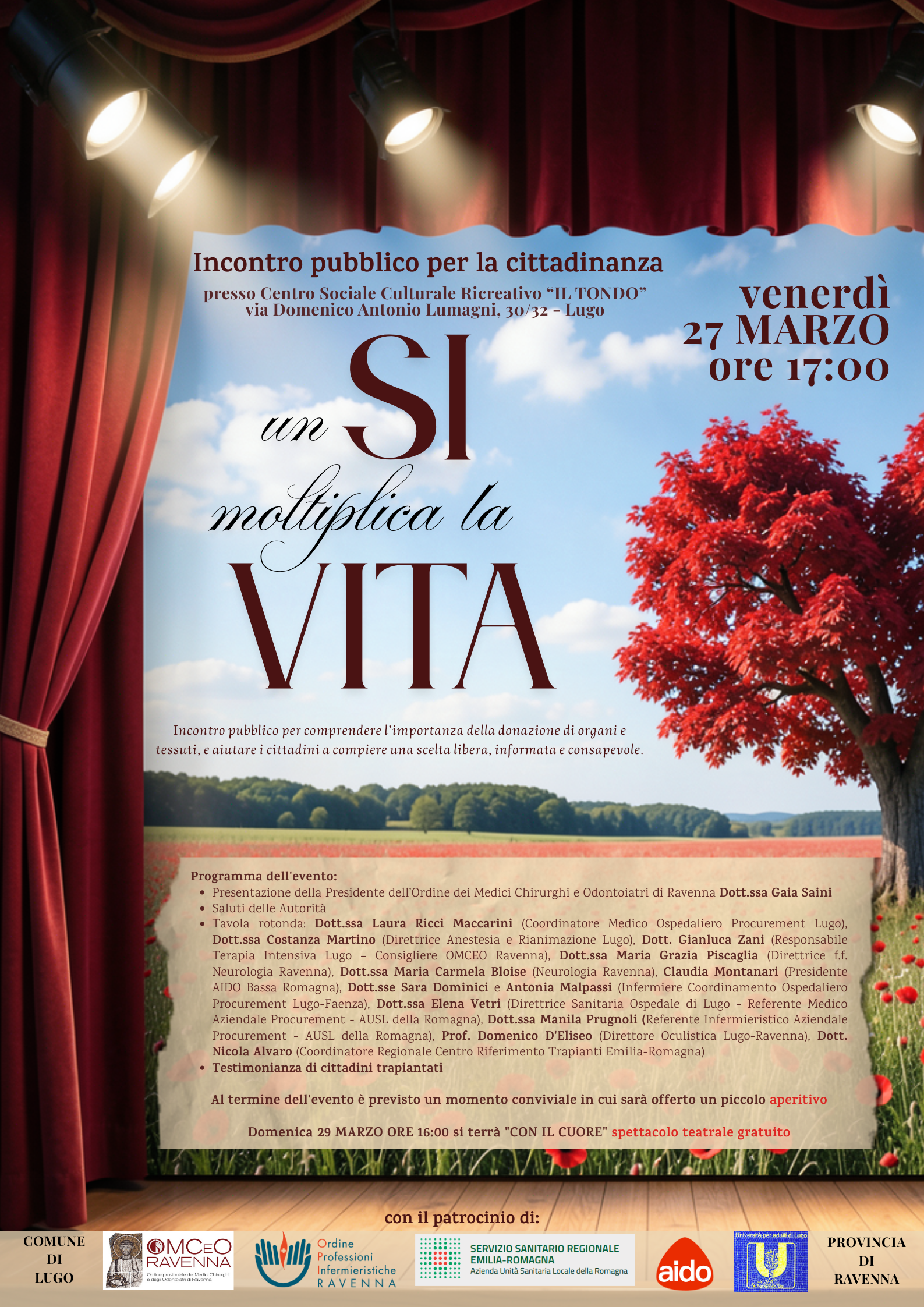 Si terrà dal 27 al 29 marzo a Lugo, presso il Centro Sociale Culturale Ricreativo “Il Tondo”, il ciclo di eventi gratuiti “Un SI moltiplica la vita”, dedicati alla donazione di organi e tessuti, con l’obiettivo di sensibilizzare cittadini e personale sanitario e favorire una scelta consapevole. L’iniziativa è promossa dall’OMCeO di Ravenna e dal Coordinamento Ospedaliero Procurement di Lugo.