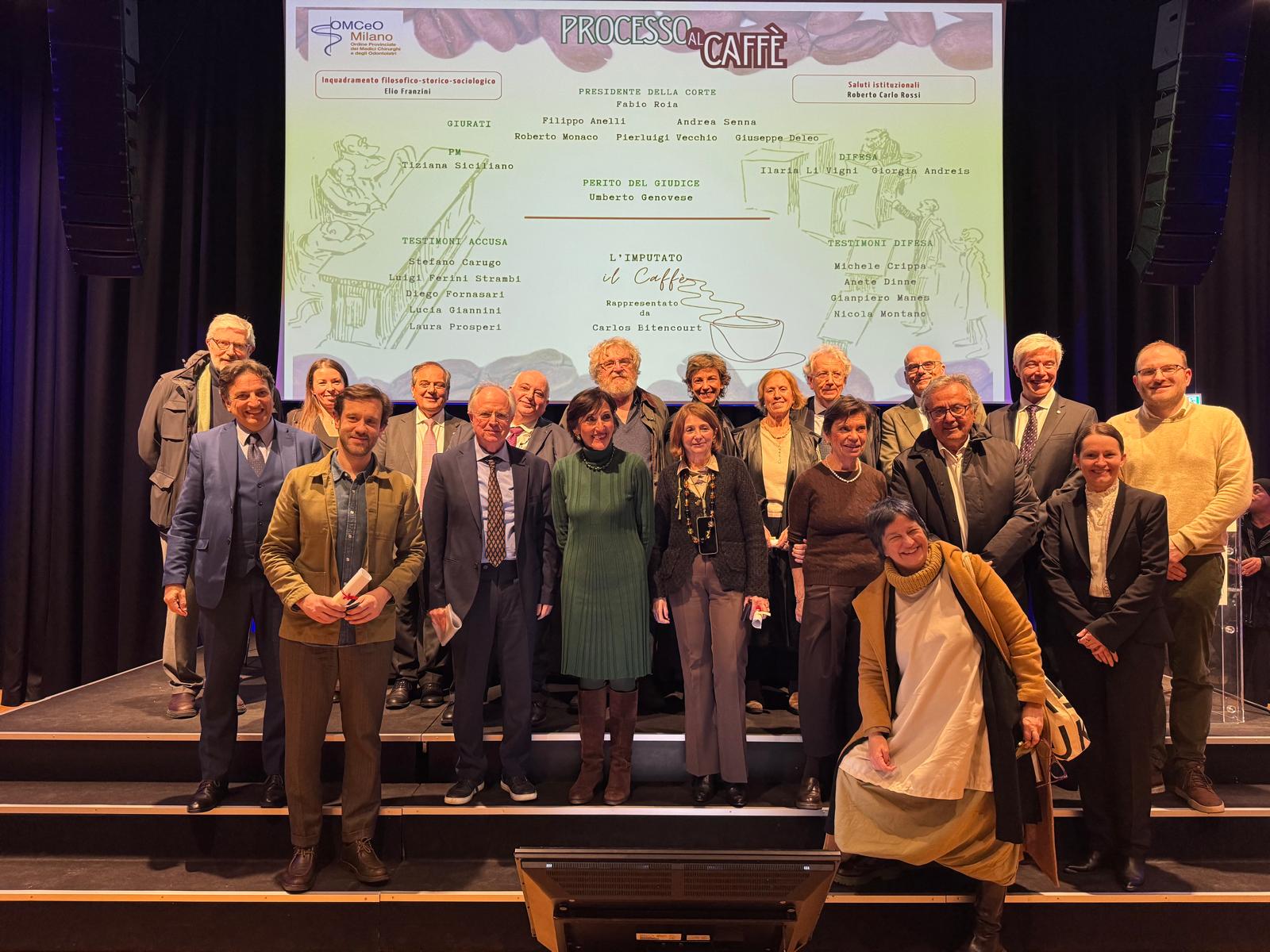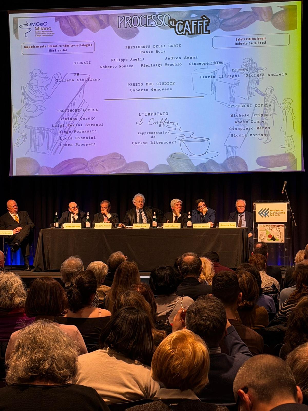 Milano, 5 febbraio 2026. Assolto, ma non senza polemiche e con qualche limitazione. È accaduto ieri sera quando l’OMCeOMI ha portato simbolicamente sul banco degli imputati il caffè, una delle bevande più amate dagli italiani, tanto che le stime parlano di 35 miliardi di tazzine bevute all’anno in Italia, 800 milioni a Milano. L’obiettivo è stato analizzare in modo critico effetti, benefici e contraddizioni. A presiedere il dibattimento del “Processo al Caffè” è stato il presidente del Tribunale di Milano, Fabio Roia. Protagonisti il pubblico ministero Tiziana Siciliano, gli avvocati della difesa, Ilaria Li Vigni e Giorgia Andreis, il perito e medico legale Umberto Genovese e vari testimoni ed esperti medici. Il processo – dopo una introduzione storica di Elio Franzini, ordinario di Estetica all’Università di Milano – si è svolto a Milano alla Fondazione Giangiacomo Feltrinelli. Al termine la Corte ha assolto l’imputato ai sensi dell’articolo 530, comma 2, del Codice di procedura penale, rilevando che la responsabilità non è stata dimostrata oltre ogni ragionevole dubbio. È stato quindi respinto il capo d’accusa ispirato all’articolo 444 del codice penale (pericolo per la salute pubblica). Nella motivazione, è stato tuttavia chiarito che il tema richiede una lettura articolata e non semplificata. In particolare, il giudice ha sottolineato la necessità di distinguere tra caffeina e caffè, richiamando il principio secondo cui va evitato un consumo eccessivo e individuando, in linea con i parametri minimi delle linee guida, una soglia orientativa di non oltre tre tazzine di caffè italiano al giorno. È stata anche ribadita la differenza tra persone sane e persone con patologie cardiovascolari, neurologiche o con disturbi del sonno.